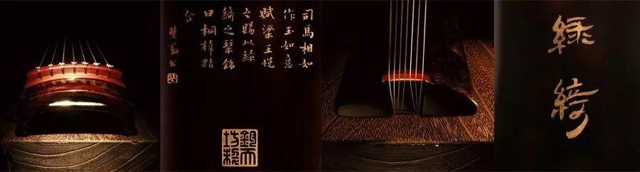 “绿绮”原为司马相如之琴,如琴铭所刻,相传“司马相如作玉如意赋,梁王悦之,赐以绿绮之琴,名曰梓桐精合”。钧天坊制“绿绮”,为其还原古代“四大名琴”之一。琴体修长挺拔,造型肩较头宽,笔直而下,典雅俊逸,风仪玉立。斫以五百年老杉木,髹以上佳传统大漆,色纯通透。徽镶七彩螺钿,琴轸悬以墨玉,岳山、焦尾、雁足等处为红酸枝。