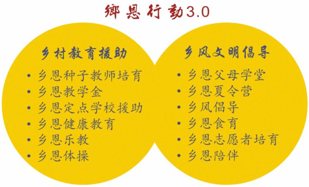 答:“乡恩行动”是允中文教基金会品牌公益项目,包括乡恩定点学校援助、乡恩种子教师培育、乡恩夏令营、乡恩父母学堂、乡风倡导等,以青年知识群体带动乡村少年儿童、百姓及社会大众的心灵安顿和文明传承,以助世风向正、民风归朴。