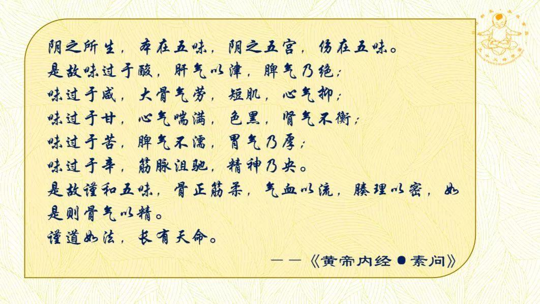 “阴之所生,本在五味;阴之五宫,伤在五味”,味能养你,但是它过了,就伤你了。“味过于咸,大骨气劳,短肌,心气抑”,吃过咸的东西,容易导致心脑血管过早的动脉硬化。