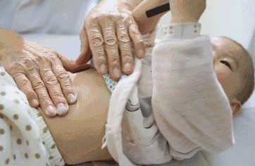 2. 揉腹。以掌腹发力,顺时针方向按揉,以肚脐眼为圆心。方法适用于一岁以上的孩子。一岁以内的孩子,手放上面,不能用力压,轻轻地揉,可以顺着他的呼吸起伏,这样来慢慢改善肠道功能。