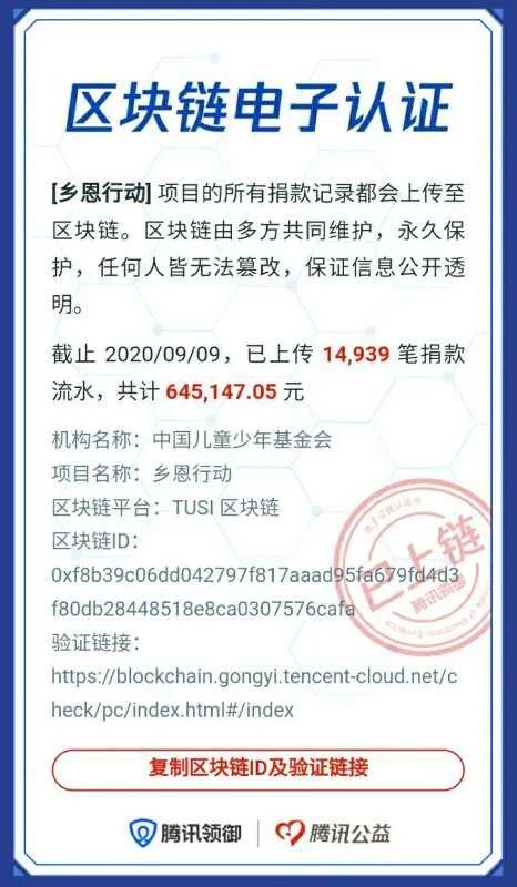今年99公益日的全部捐款项目,都获得了腾讯区块链的电子认证。这使得捐款过程的数据无法篡改、不可伪造、可以追溯、公开透明,同时也有效解决数据流通共享过程中的安全问题。