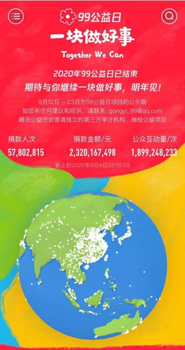 本次99公益日互动人次高达18.99亿,是去年的2.15倍;5780万人次爱心网友通过腾讯公益平台捐出善款23.2亿元,加上爱心企业3.24亿配捐和腾讯基金会提供的3.9999亿元配捐,本次99公益日总共募得善款达到了30.44亿元。