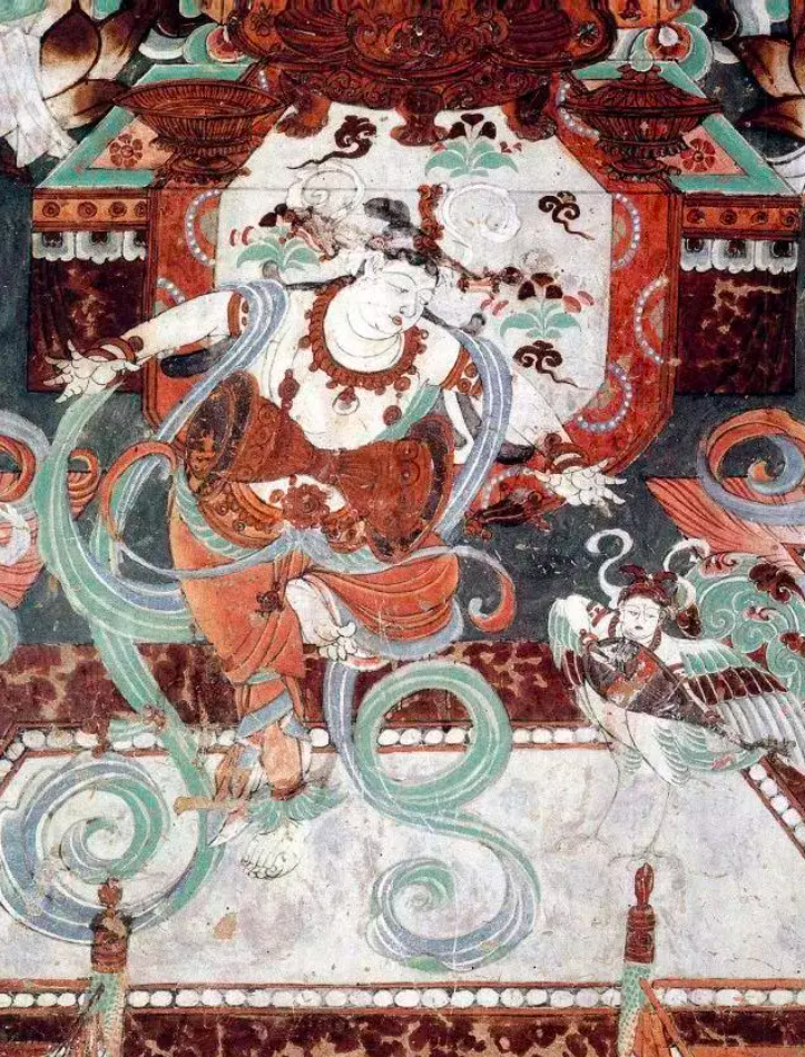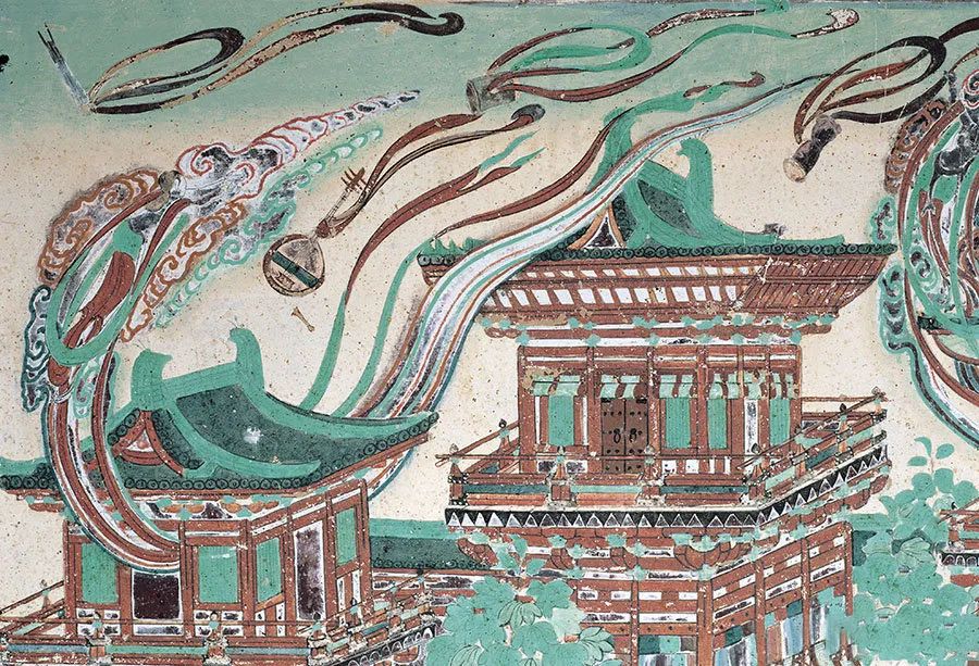 (莫高窟第217窟,盛唐,不鼓自鸣的笙、阮、羯鼓、都昙鼓与穿楼阁而出的飞天彩带飘舞,使寂静的虚空生动而令人遐想。摄影:莫高窟)