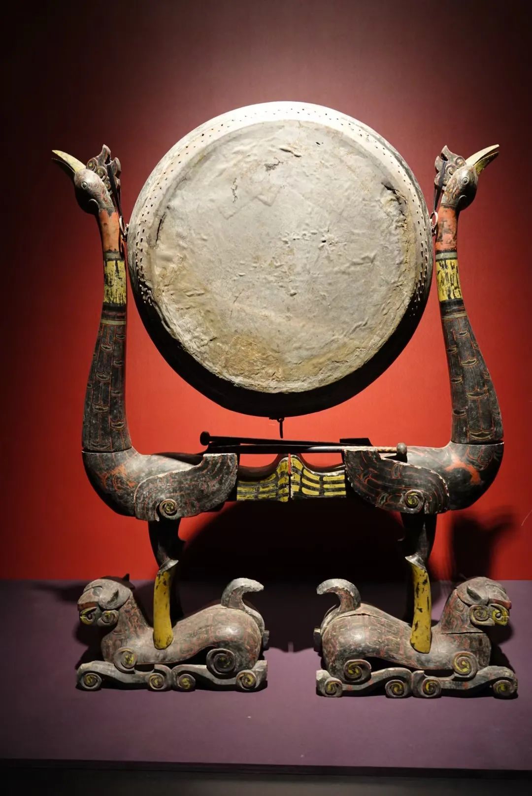 (虎座鸟架鼓,战国,荆州博物馆藏。虎座鸟架鼓以两只昂首卷尾、四肢屈伏、背向而露的卧虎为底座,虎背上各站立一只引吭高歌的鸣凤,两凤中间悬挂一面大鼓。这种器物目前仅见于湖北、湖南、河南等楚地贵族墓葬,是楚地特有的一种乐器。文字来自荆州博物馆,摄影:李阳)