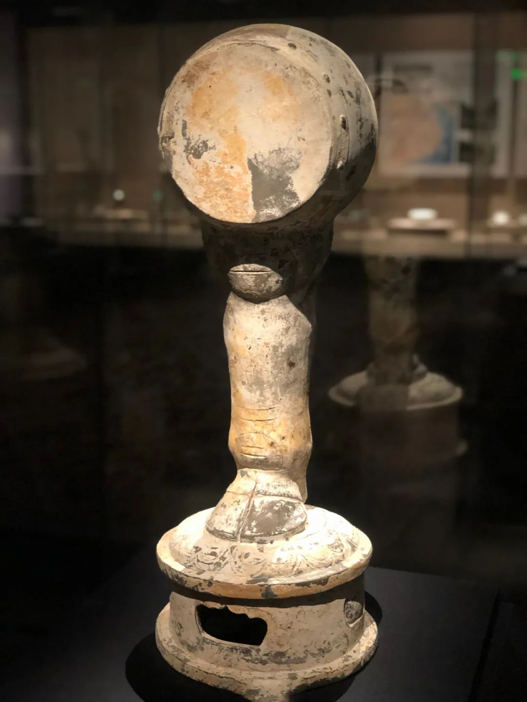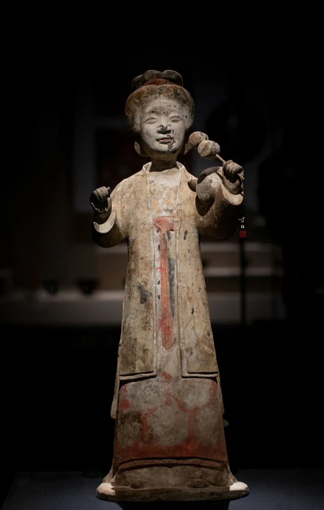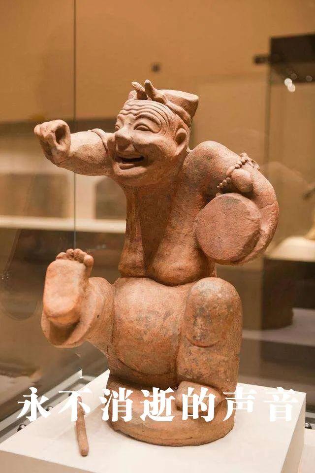 (击鸡娄鼓鼗牢鼓俑 ,后蜀,都博物馆藏 2001年成都后蜀赵廷隐墓出土,同墓出土20余件乐舞伎彩绘陶俑,服饰华丽,造型精致生动,从乐器、舞蹈、戏剧等方面反映了五代十国时期四川地区的音乐文化。摄影:寸日)