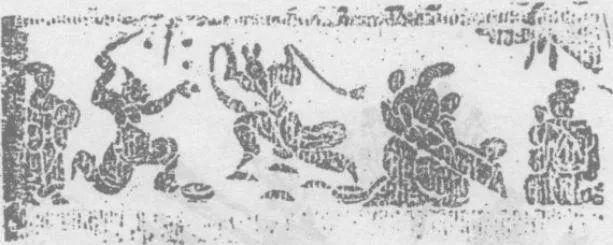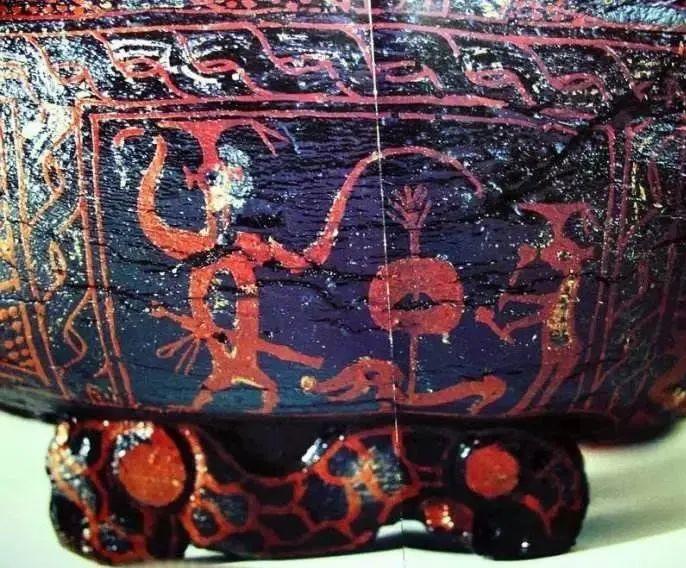 (曾侯乙墓出土的彩漆木雕鸳鸯形盒上的建鼓舞图,湖北省博物馆藏。)
