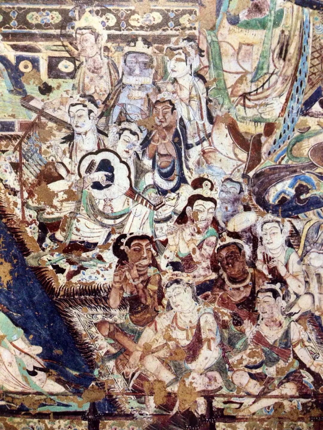 (敦煌220窟北璧《药师经变图》东侧乐队,十三位乐人神态各异,演奏细腰鼓、横笛、尺八、笙、拍板、锣、花边阮、方响、筚篥、筝、排箫、毛员鼓、都昙鼓。这是唐代宫廷燕乐的乐器。)