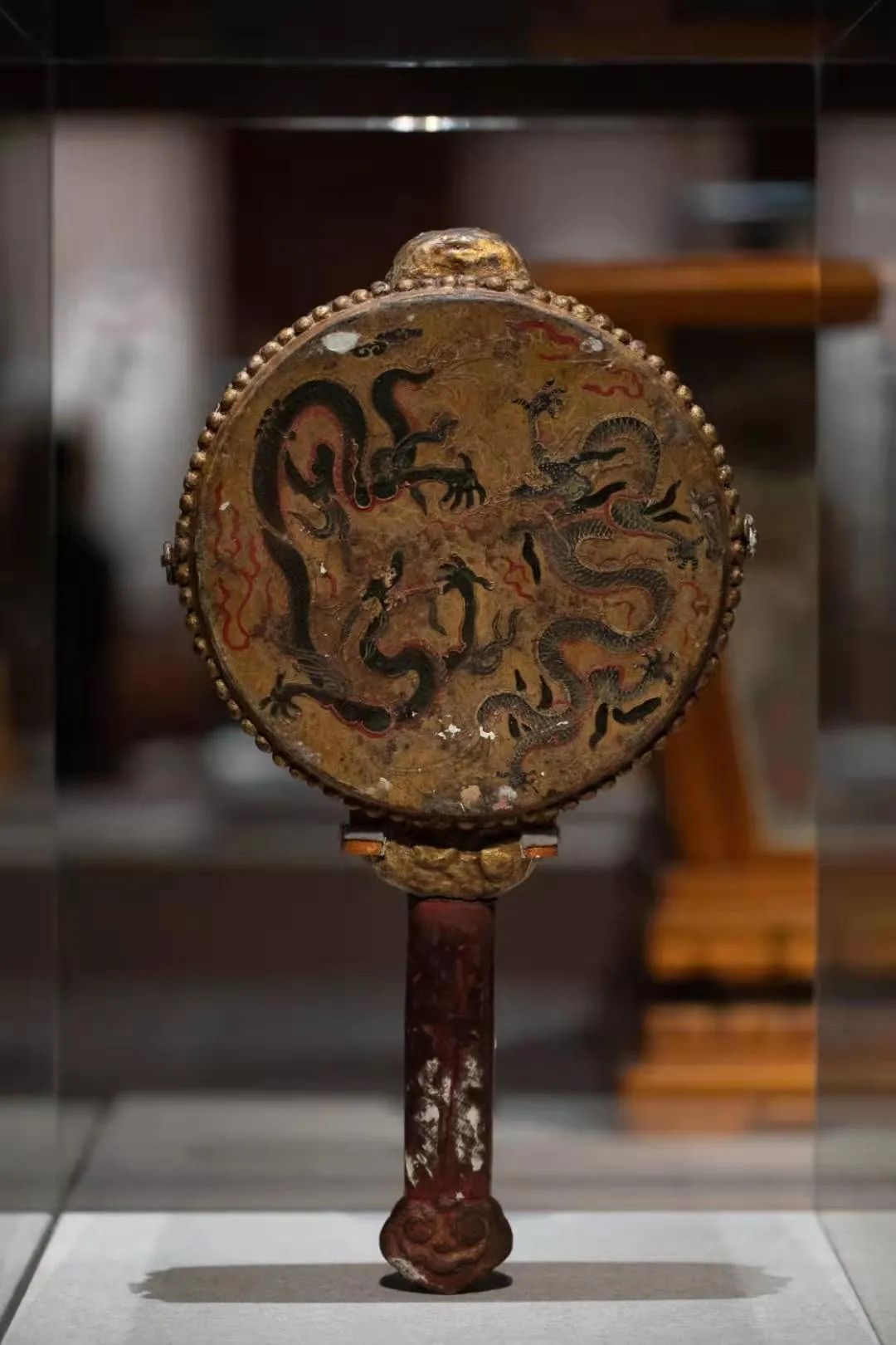 (红漆彩画云龙纹手鼓,清,故宫博物院藏。鼓框上蒙革面,面上才回双龙戏珠纹,间以火云纹,形象生动。摄影:苏木)
