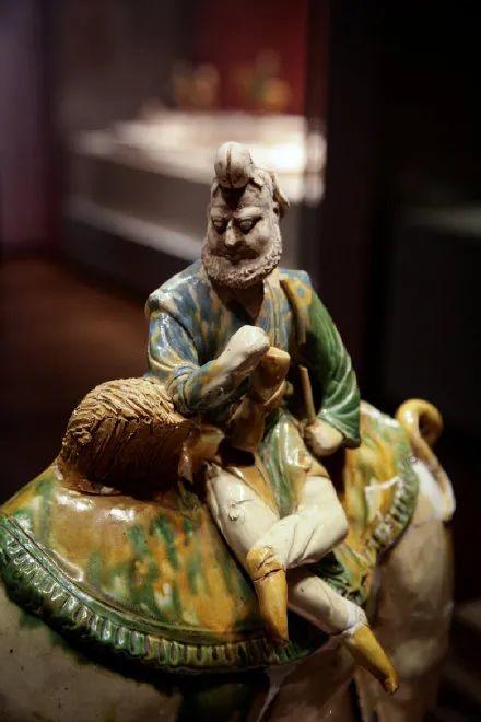 (唐三彩骑驼奏乐俑,这尊骑驼奏乐俑的乐师是典型的高鼻深目络腮胡的胡人形象,手中的拍鼓也是从西域传来。摄影:博物馆刷展的白衣客)