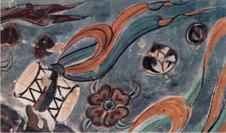 (《观无量寿经变》舞蹈中的腰鼓演奏,莫高窟榆林25窟)