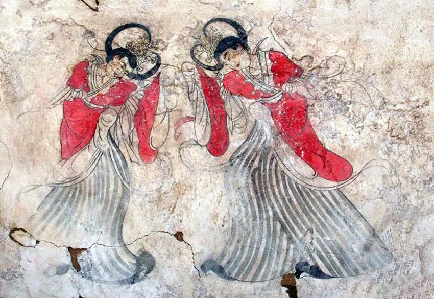 (陕西昭陵陪葬墓双人舞壁画,舞者着翻领宽袖舞服,头上簪花。飘带、衣饰飘拂,在一刹那停顿中,相对点头屈身靠近的动势和舞者配合默契的亲切表情。)