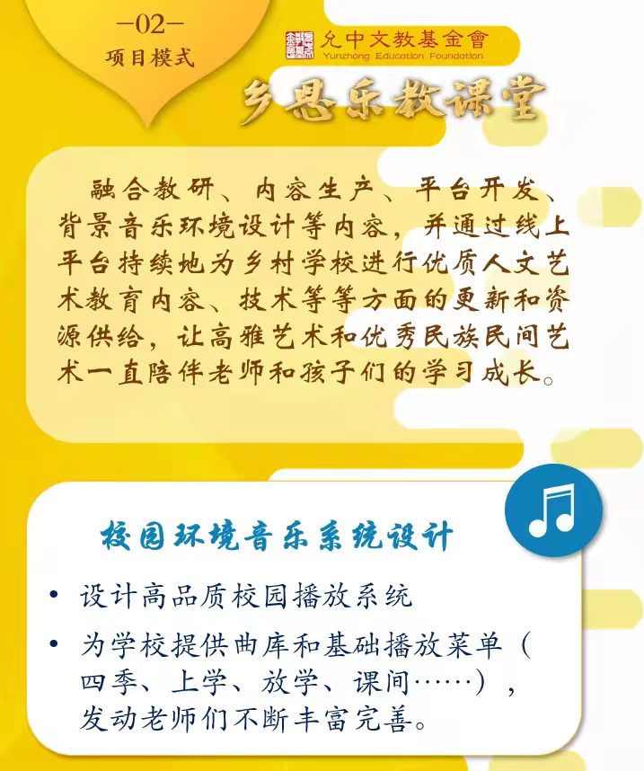 “乡恩乐教课堂”是允中品牌公益项目中华乐教、乡恩行动交叉子项目,这个项目的成型,得益于过去十多年,我们在师资培养、乐教校园、乐教课题、教材制作等方面大量积累,2018年起持续进行的乐教乐库、乐教内容中心建设;以及10余年的乡村教育援助,乡恩志愿者在全国近200个乡村开展过乡恩夏令营、乡恩父母学堂等工作。机构数字化建设和软件软发的持续推进,也将为其后大面积推广奠定基础。