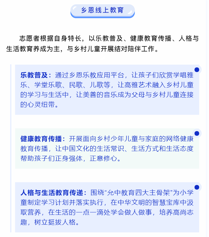 乡恩3.0阶段,我们不仅和乡村地区教育部门、乡村学校联合开展系统的教育援助,还希望线上线下结合,以乡恩志愿者和乡村教师为纽带,通过“云课堂”的学习,日常学习引领、心灵沟通等形式,让陪伴与关爱永不缺席,为留守儿童一生打下质朴美善的心灵底色,实现人格与生活教育的传递、乐教的扎根落实和健康教育的传播。