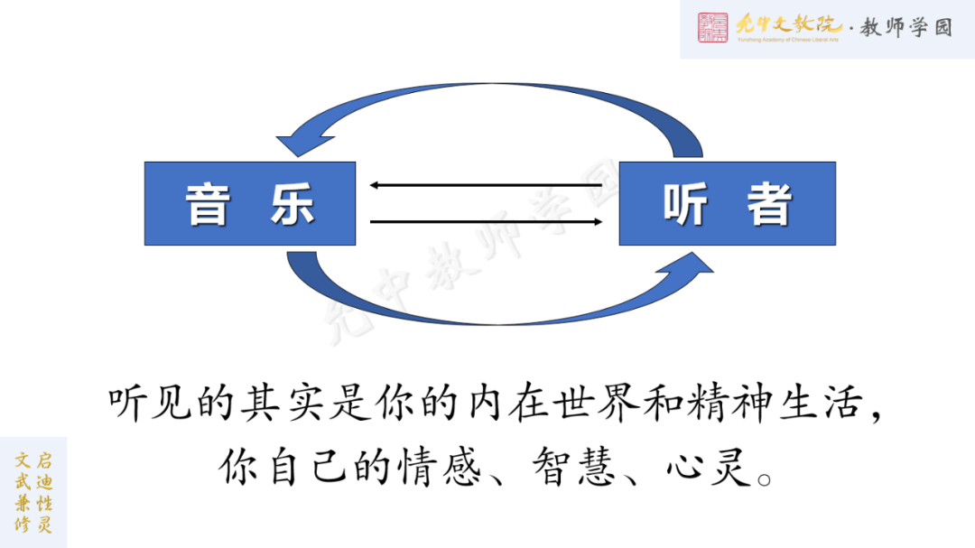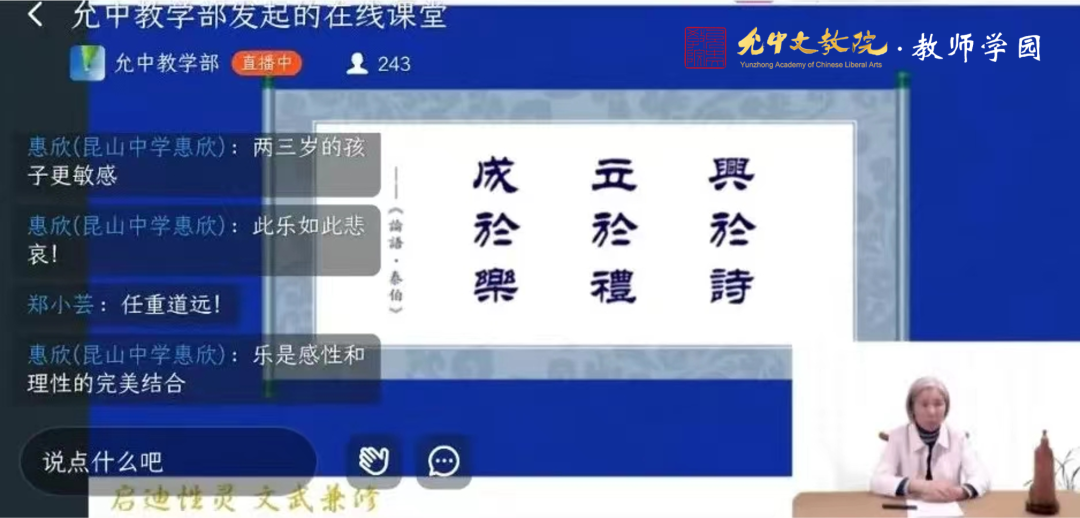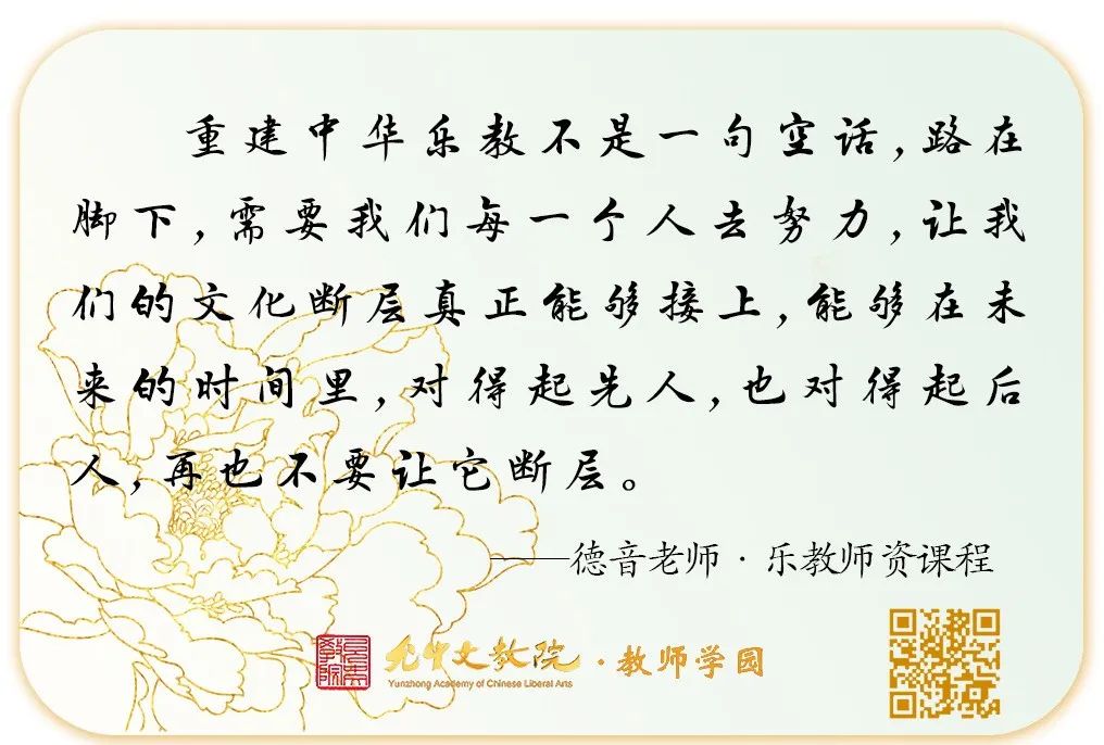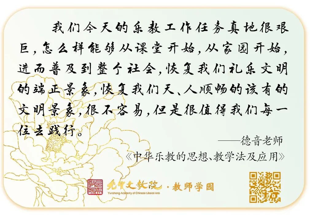 课程中,德音老师深入浅出地为大家讲述着中华乐教的思想、精神、内涵,旁征博引、慧思迸发,让人应接不暇,中华文明的教育是有着大智慧根脉的,我们当代该怎样接续、传承?