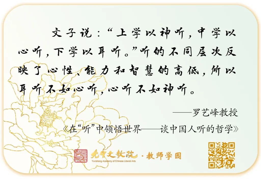 罗艺峰教授则把老师们引入一个充满哲思的“听”的世界,原来中国文化的“听”道所涉及的内容之广泛、内涵之深刻,如此让人叹为观止!