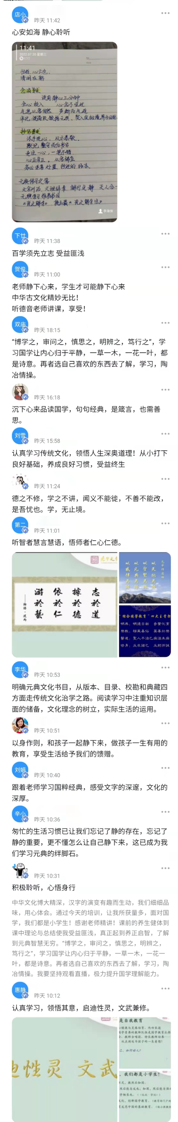 在这次课程中,我们以古之圣贤为师,学“道”、论“道”,那么如何用“道”来引领教育,如何借“道”之势,与孩童沟通呢?我大致总结了几点:1.真诚——精诚所至,金石为开,用爱感化孩子。2.善念——静则一念不生,动则止于至善,用善引领孩子心智。3.自修——不能悦己,如何动人?关照内心需求,先自我教育,再实现教育他人。4.慎独——慎隐揉,慎所修。用敬畏之心做教育,以身作则,潜移默化地影响学生……我们的中华文明在历史的长河中璀璨了数千年,这是古之先贤留给我们的传家宝,是他们留给子孙后代的智慧箴言。希望我们可以化身前辈与后代的使者,把这些古人呕心沥血之作呈现在孩子们的面前,带给他们新的启迪。