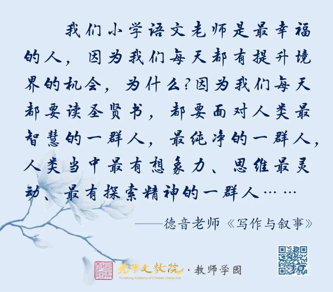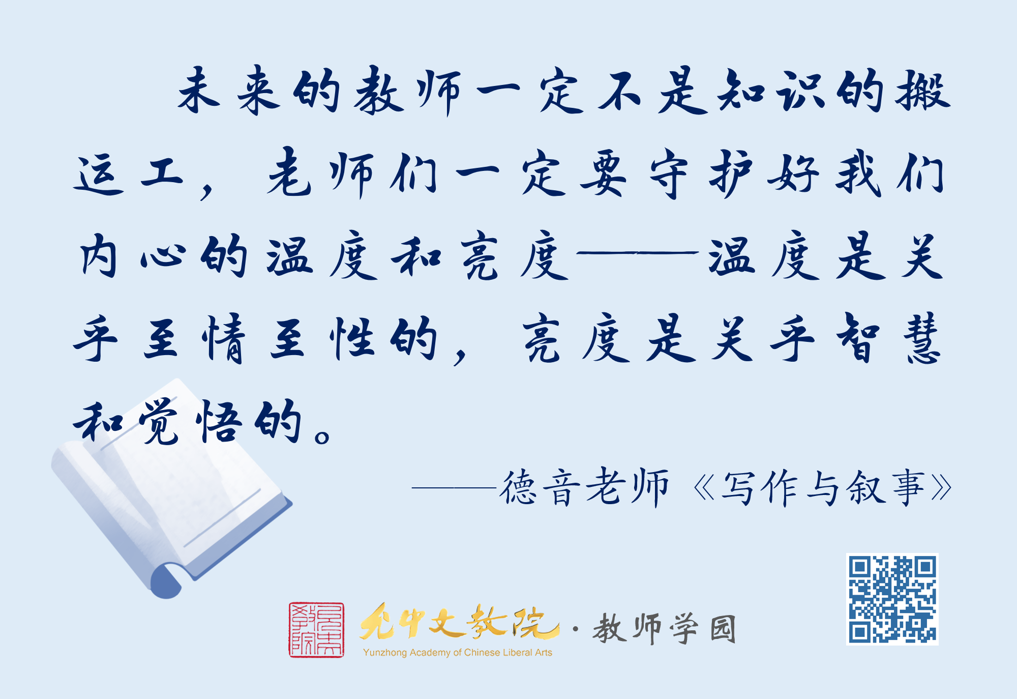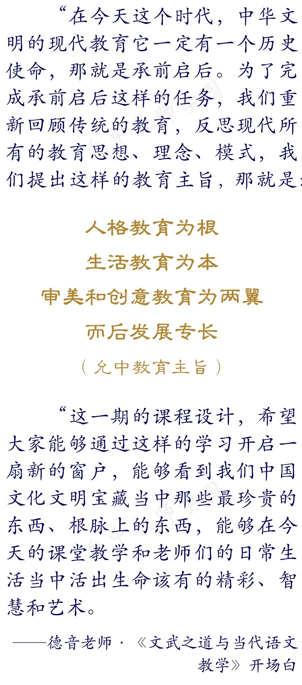 这是7月20日德音老师在允中教师学园暑期乡村教师资助课程第一堂课的开场白。20—21日两天时间,关于古文经典教学和中国文化的教育之“道”、真正的东方的博雅教育,老师们听到了太多闻所未闻、震撼心灵的精深内容。经典教学绝不是仅仅只有背诵、读写,这期课程非常系统、深入、完整,信息量很大,也特别需要静心深入参悟、持久修习。