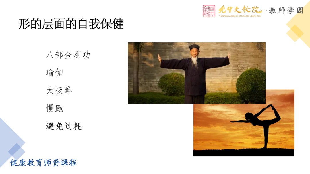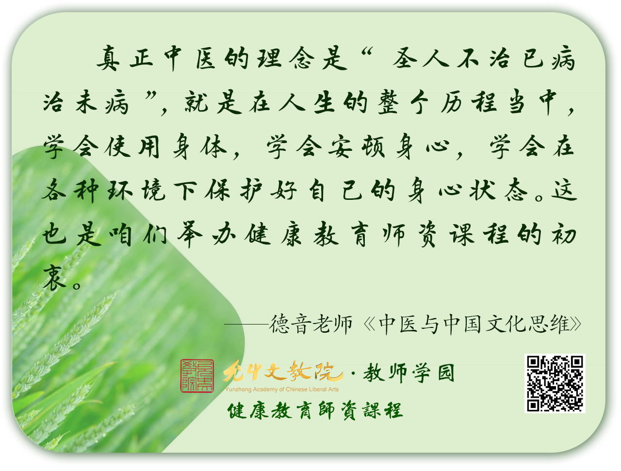 通过健康教育基础研究与传播倡导多种形式开展公民健康教育,倡导“治未病”及身心一体的健康生活理念,培养清正俭朴、健康自然的生活习惯,以养成圆融和谐、自利利人的生活态度和处世艺术,辅以中华文明独特科学思维和富有原创智慧的认知自然、生命和宇宙的世界观的拓展培养。