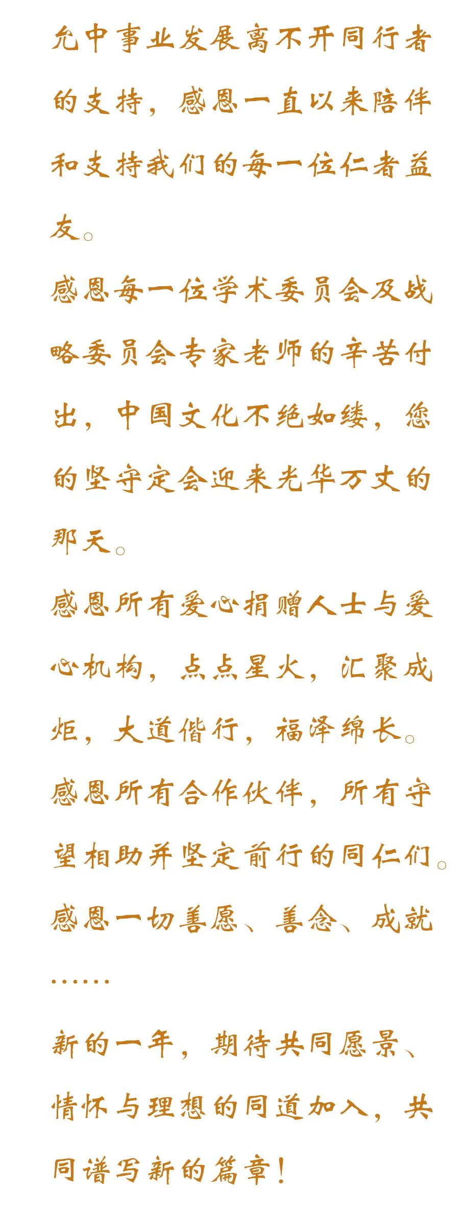 允中文教基金会以支持开展文化传承、研究、实践与普及工作为己任,为资助允中教育事业发展、人文风尚培育辛勤耕耘。回顾2022,虽困阻无形、挑战重重,但工作推进从未停步。