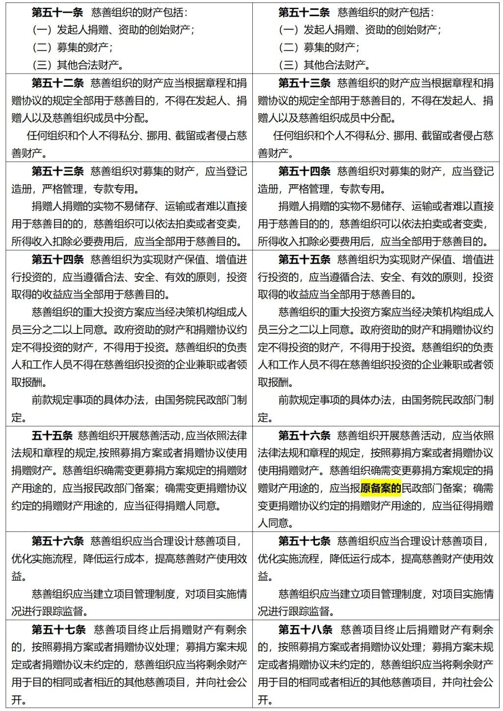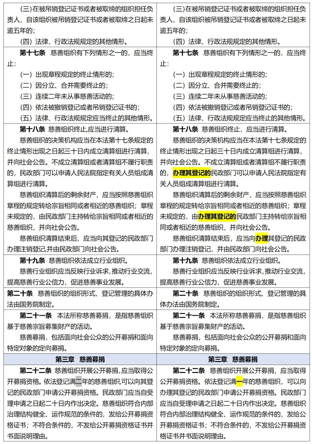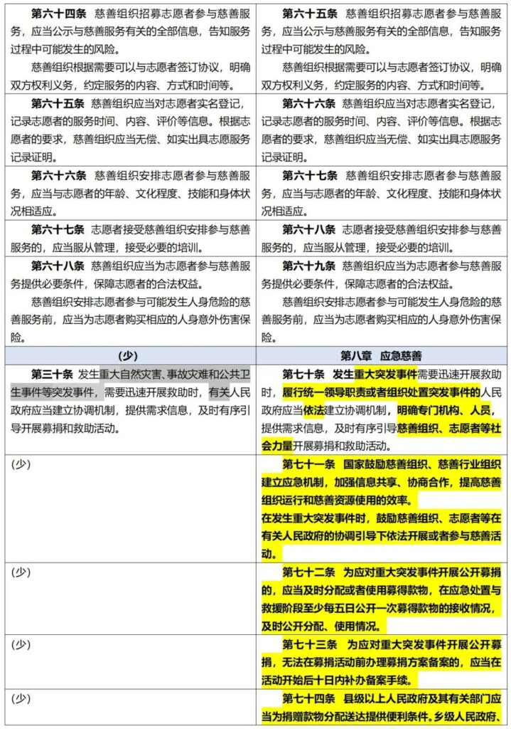 《中华人民共和国慈善法》修正前后全文对照表 来自 项目部|已发表 2024年1月18日 《中华人民共和国慈善法》 修正前后全文对照表 (条文中黑体字部分为增加或者修改的内容,阴影部分为删除的内容,下划线部分为移动的内容) 文章来自网络 排版:嘉灵 审核:嘉禾