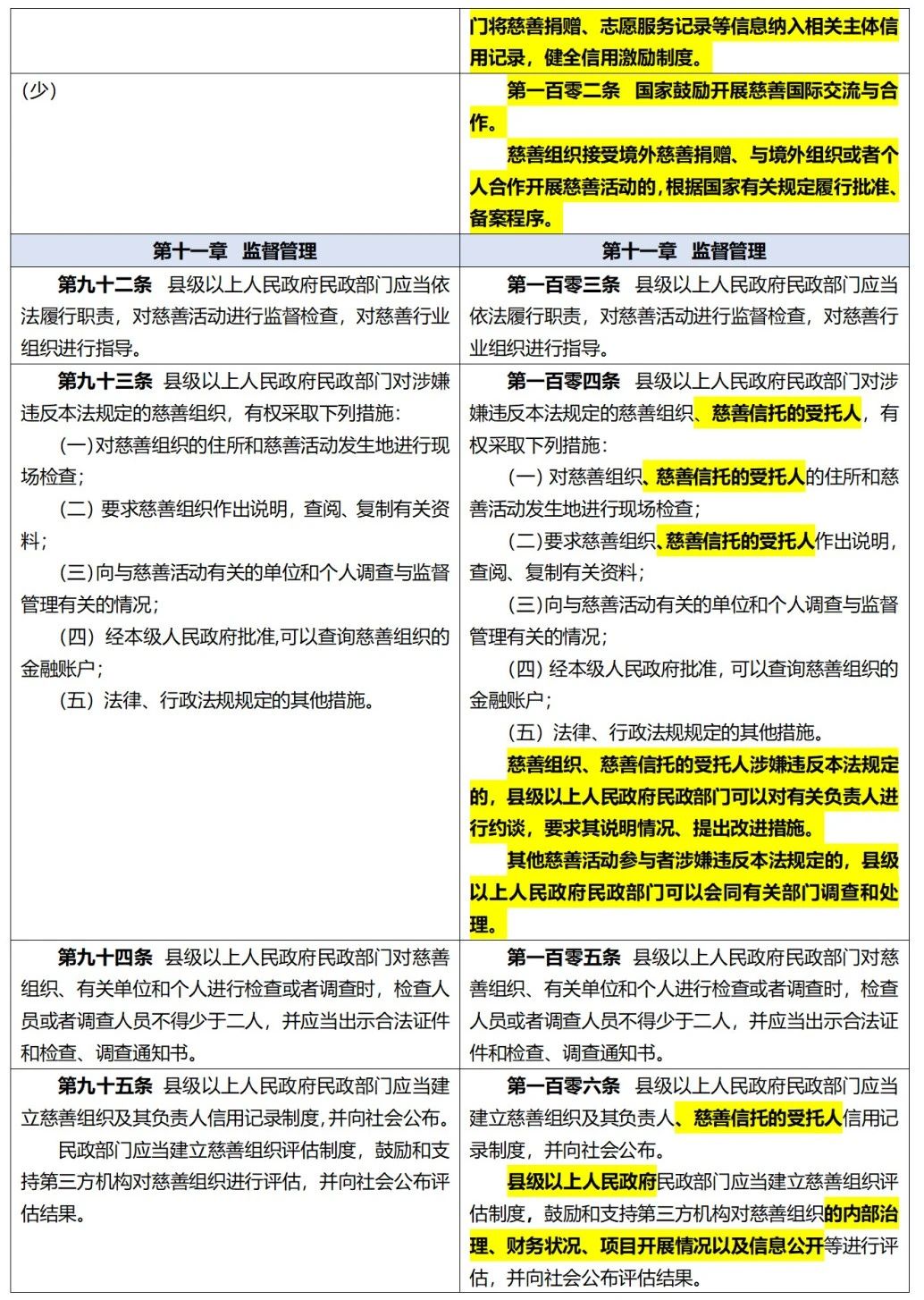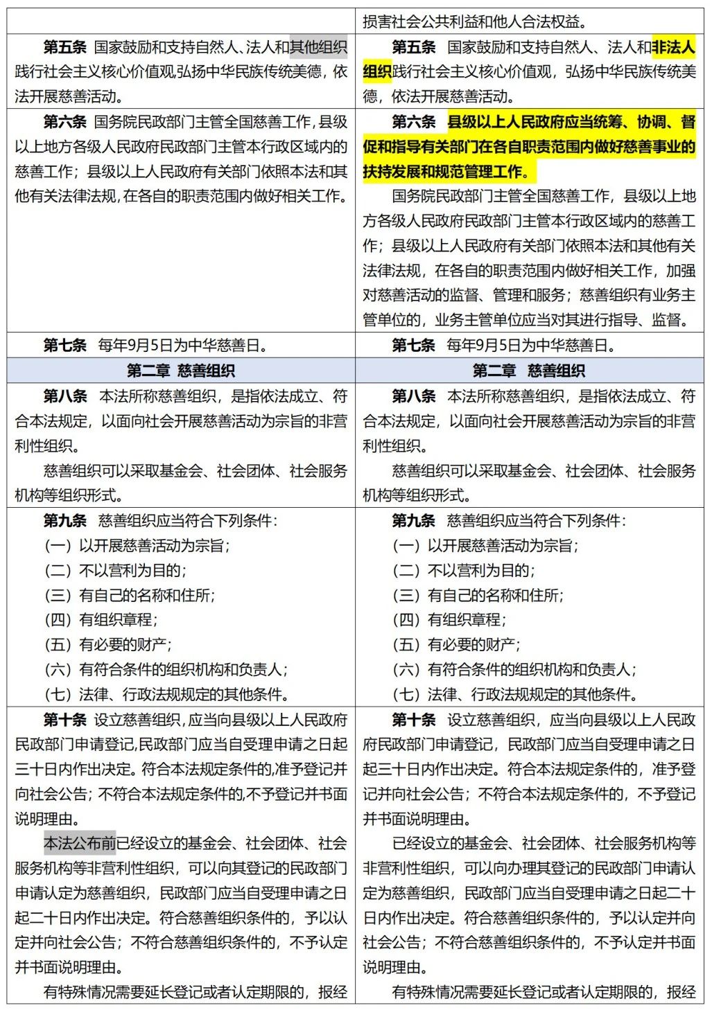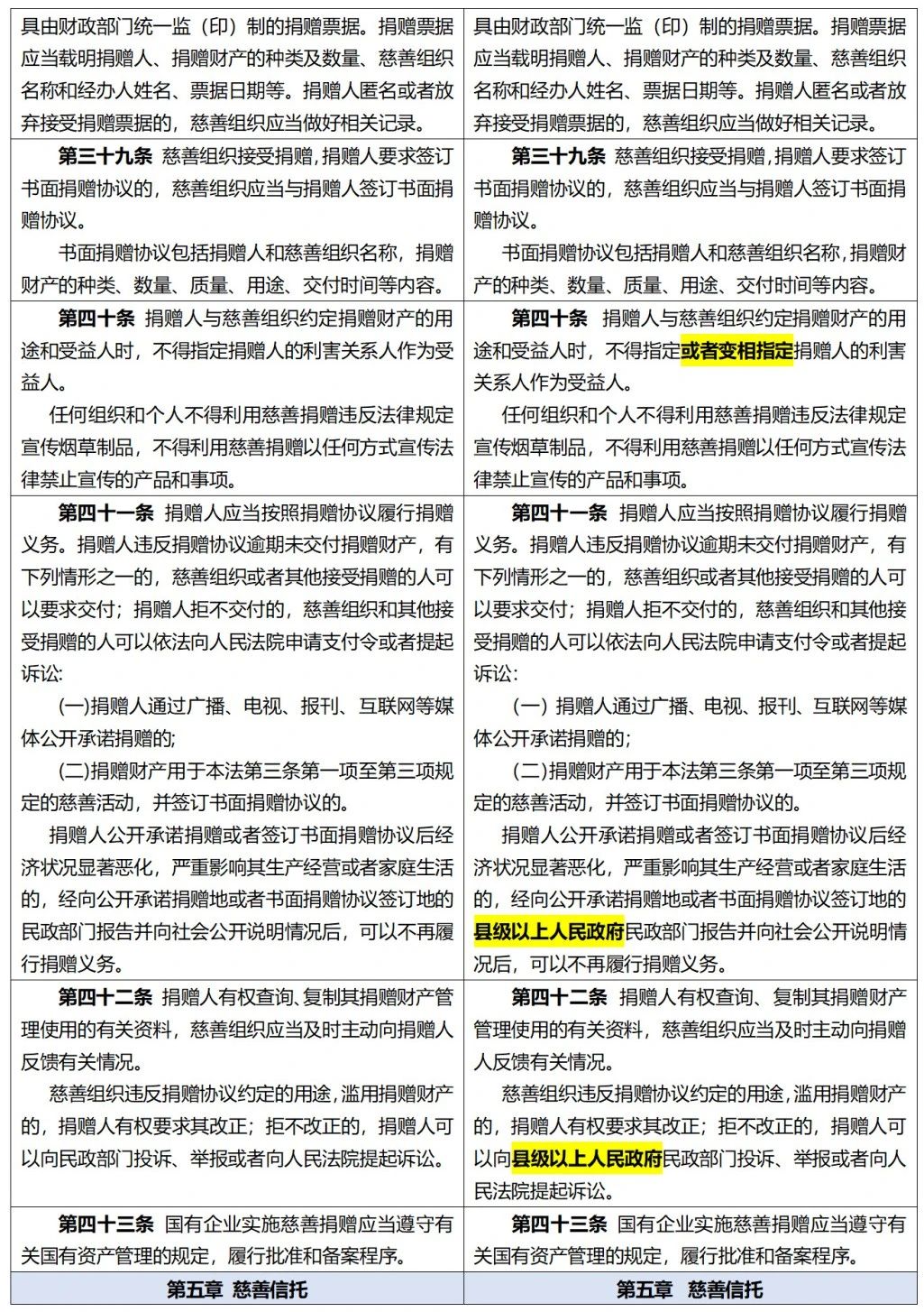 《中华人民共和国慈善法》修正前后全文对照表 来自 项目部|已发表 2024年1月18日 《中华人民共和国慈善法》 修正前后全文对照表 (条文中黑体字部分为增加或者修改的内容,阴影部分为删除的内容,下划线部分为移动的内容) 文章来自网络 排版:嘉灵 审核:嘉禾