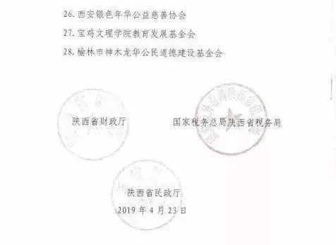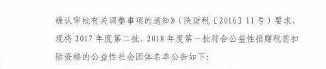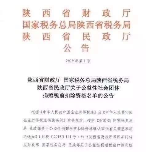 根据《中华人民共和国企业所得税法》及《中华人民共和国企业所得税法实施条例》有关规定,按照《财政部 国家税务总局 民政部关于公益性捐赠税前扣除资格确认审批有关调整事项的通知》(财税[2015]141号)和《陕西省财政厅等四部门转发财政部 国家税务总局 民政部关于公益性捐贈税前扣除资格确认审批有关调整事项的通知》(陕财税[2016]11号)要求,陕西省财政厅、国家税务总局陕西省税务局、陕西省民政厅公布2017年度第二批、2018年度第一批符合公益性捐赠税前扣除资格的公益性社会团体名单,允中文教基金会获2018年度第一批公益性捐赠税前扣除资格(19号)。