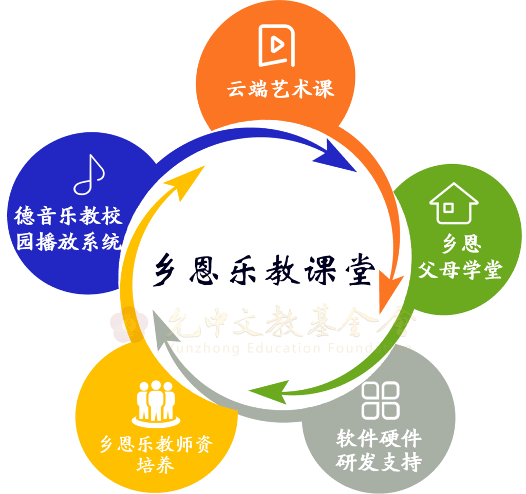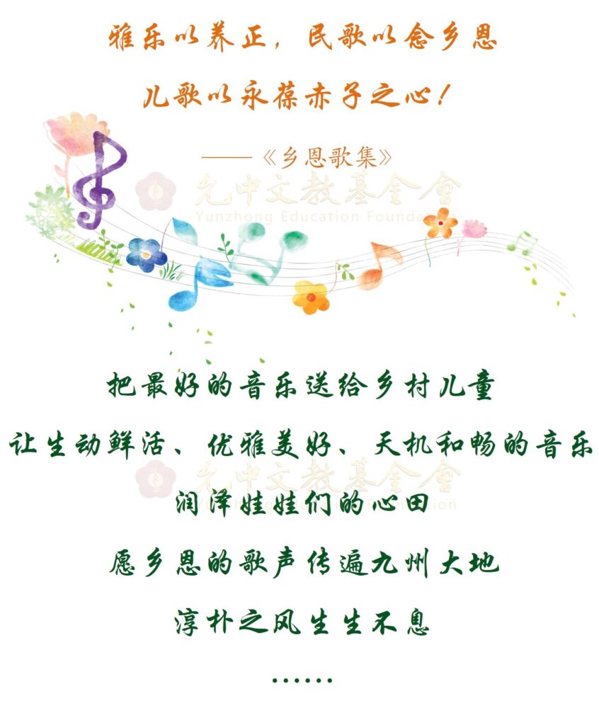 “乡恩乐教课堂”是允中品牌公益项目“中华乐教”“乡恩行动”联合子项目,致力于将千年中华乐教与中国教育精神的内涵用现代的方式在乡村教育中扎根,在环境教育、音乐教育中融入人格教育、审美与创意教育内涵,让古典艺术和民族民间艺术的精华成为现代学校教育的素材、资源,让学校这个文化传承的第一阵地永不失位,让基础教育中不缺音乐母语,并发挥学校的辐射作用,让音乐母语重回国民精神文化生活。