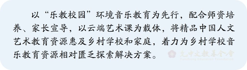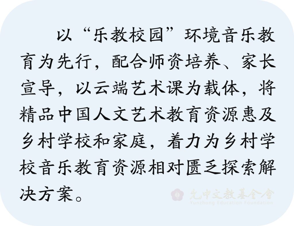 通过建设乐教视听教室,邀请德艺双馨的艺术大家和教育家为孩子们录制乐教课程,精选、精编精品经典内容,将优质艺术资源直接引入乡村学校课堂。