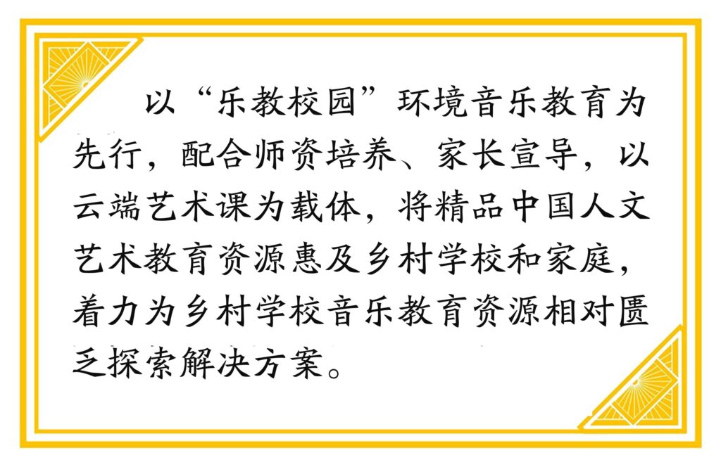 然而,在中国文化断层的时代背景下,中华乐教在人格养成、净化社会风尚的重要作用尚未被广泛认知。高雅艺术资源与基础教育之间缺乏连接的桥梁,人格教育与审美创意教育在现行教育体制内严重缺失,乡村教育领域是尤其薄弱的一环。