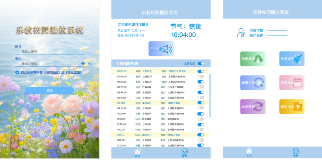 基于可视化操作设备设计开发的校园广播系统APP。为学校搭建优质、优雅、自动化、智能化的符合乐教教学设计理念的校园环境音乐系统,集成可视化校园广播系统,解决众多学校“常规打铃器”操作繁琐的痛点。