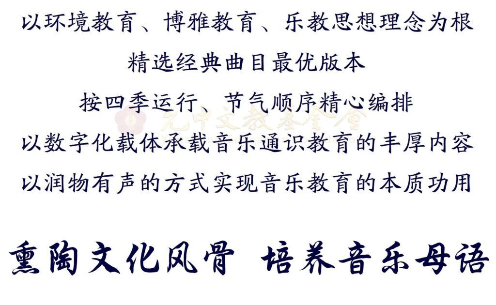 《乐教校园教程》由1600分钟左右的优美动听的经典乐曲按照四季运行、节气顺序精心编排而成。以环境教育、博雅教育、乐教思想理念为根,同时考虑到心灵疗愈、放松减压、亲近自然等需求,曲目以中国古典音乐、民族民间音乐、现代中国音乐、童声合唱的经典作品为主,辅以轻音乐、自然音乐、世界名曲,精选经典曲目的最优版本。